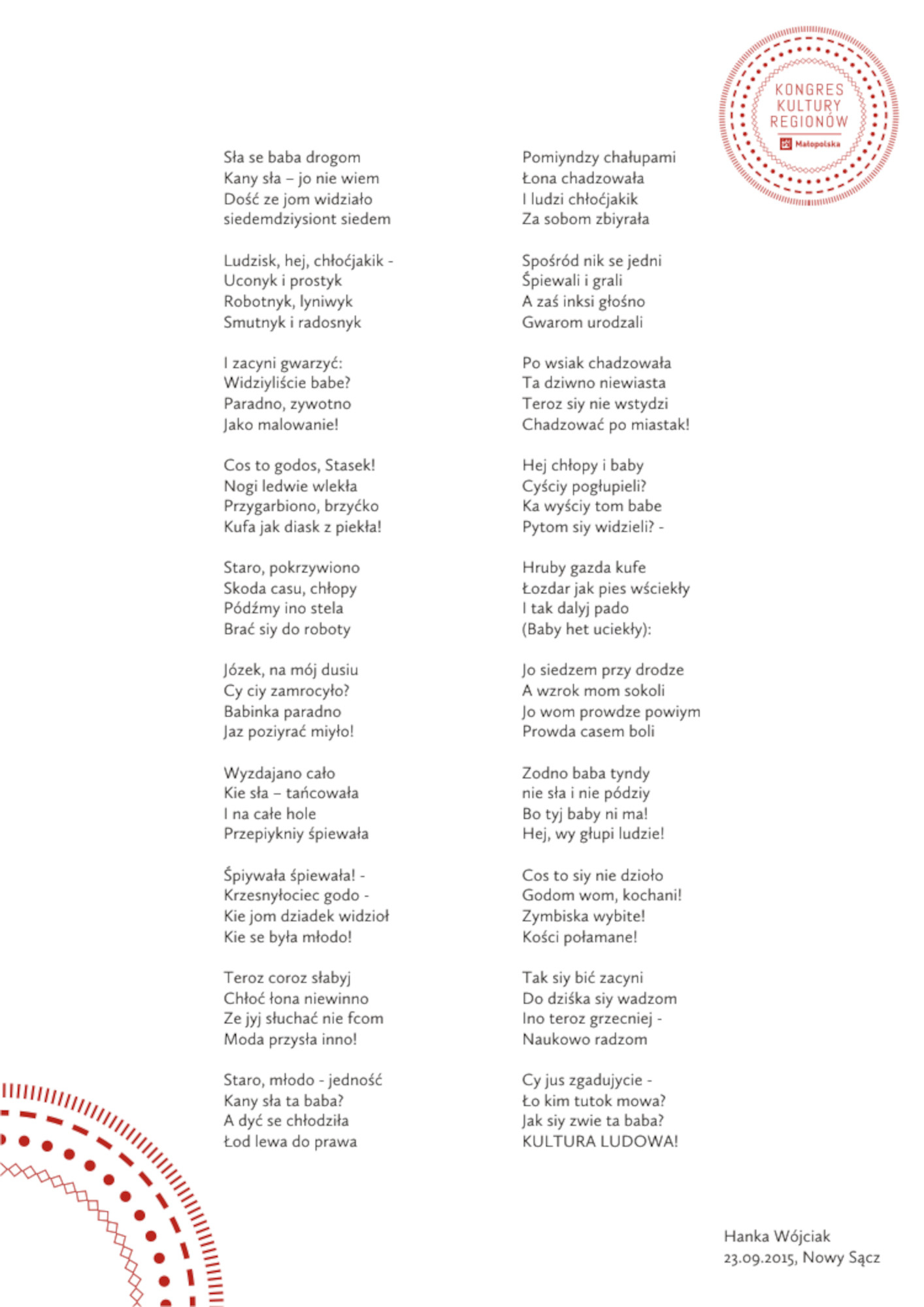 Kultura Ludowa 22 września 2015 W ramach panelu REINTERPRETACJA powstał wiersz autorstwa Hanki Wójciak.
